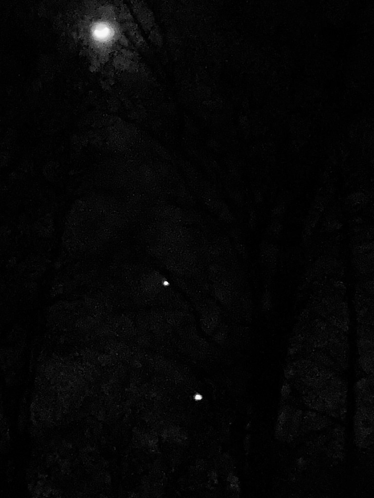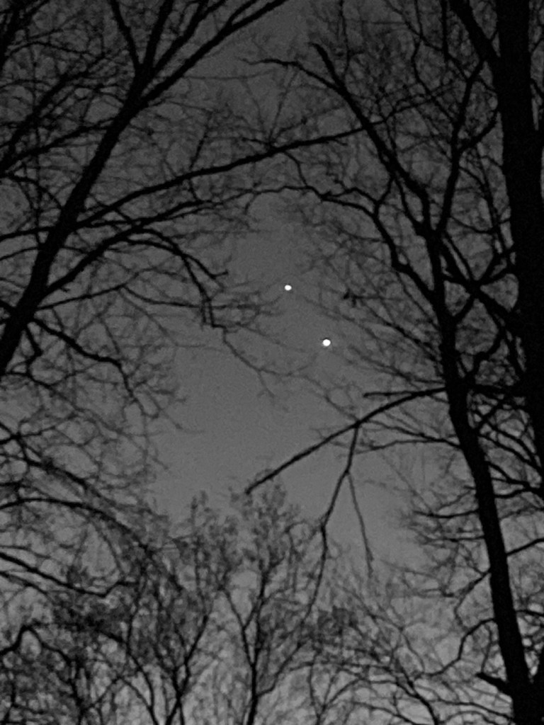 In this picture taken by Tony Meyerhofer we see at the top a crescent moon (easier before the picture was blown up), then Jupiter, then Venus. It was taken through the trees outside our house. This was around February 23.