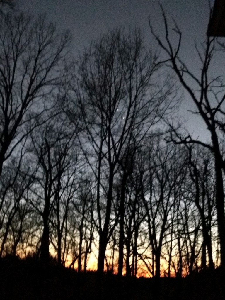 Taken just after sunset (probably on February 28) you can see the two planets, Jupiter and Venus, caught in the trees just above the middle of this picture. You can also see that roughly speaking the alignment of the planets points to the brightest part of the sunset below. This picture is later than the first one because the moon is not visible. It is high above.