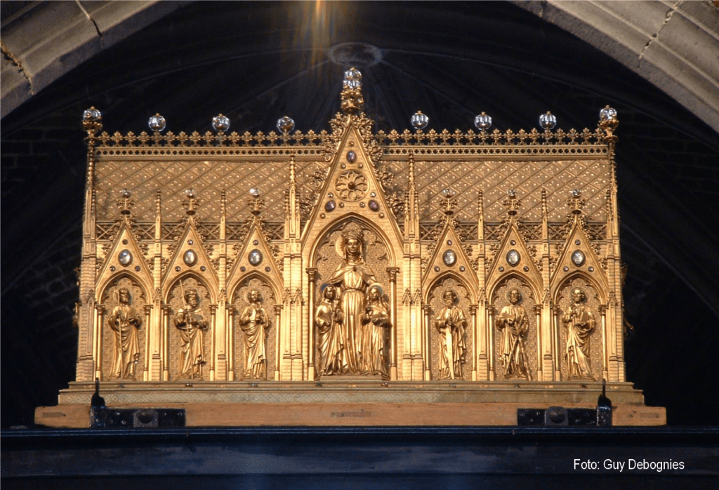 Waltruda was also in a monastery, but in Belgium. She lived about 100 years earlier than Walburga. Both of them have large, beautiful churches commemorating their lives in the places where they headed abbeys. This is Saint Waltruda’s reliquary in Mons, Belgium. (Wikimedia commons)