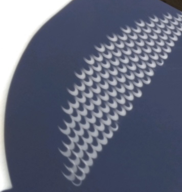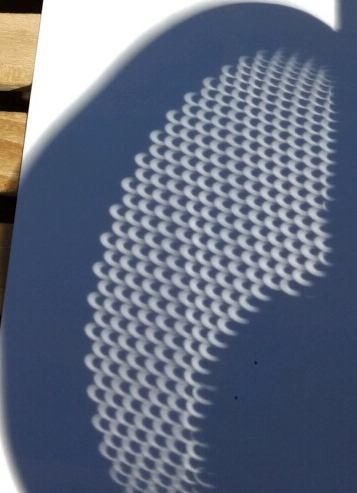 I discovered long ago that you don’t need a piece of paper. I was dancing down Thornapple, at some young age, when I saw that the maple leaf shadows at my feet had little lighted crescents all through them. I don’t remember knowing ahead of time that there was a partial eclipse that day. I discovered that you can lace your fingers and get the same effect. A small enough hole in anything works. And “small enough” is relative to how far away the shadow is.