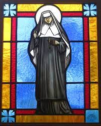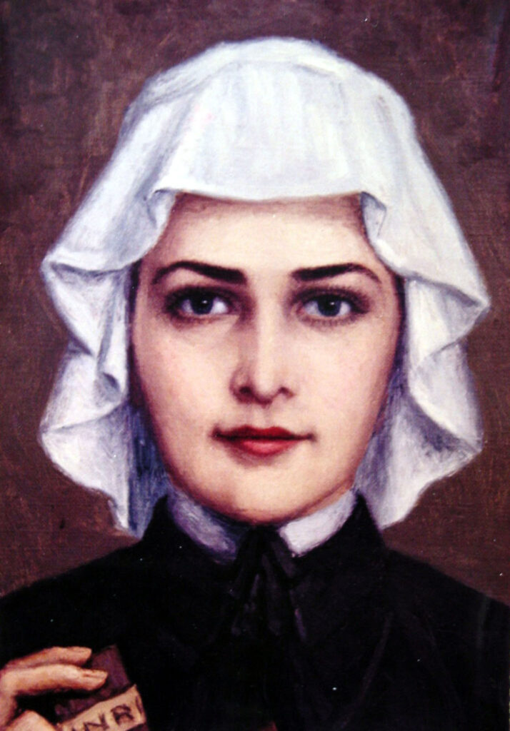 On a whim I checked out Saint Elizabeth Ann Seton. My internal memory of her images, always shows a profile, and in fact most pictures are like that. BUT, she is famous for a bonnet with a bit of a wavy edge and for a garment with shoulder capes. When I finally found a full face image, I thought that’s it.