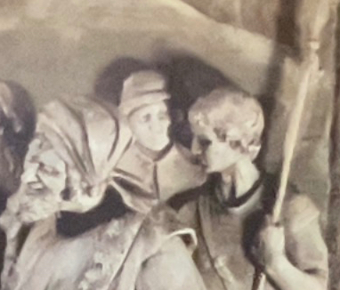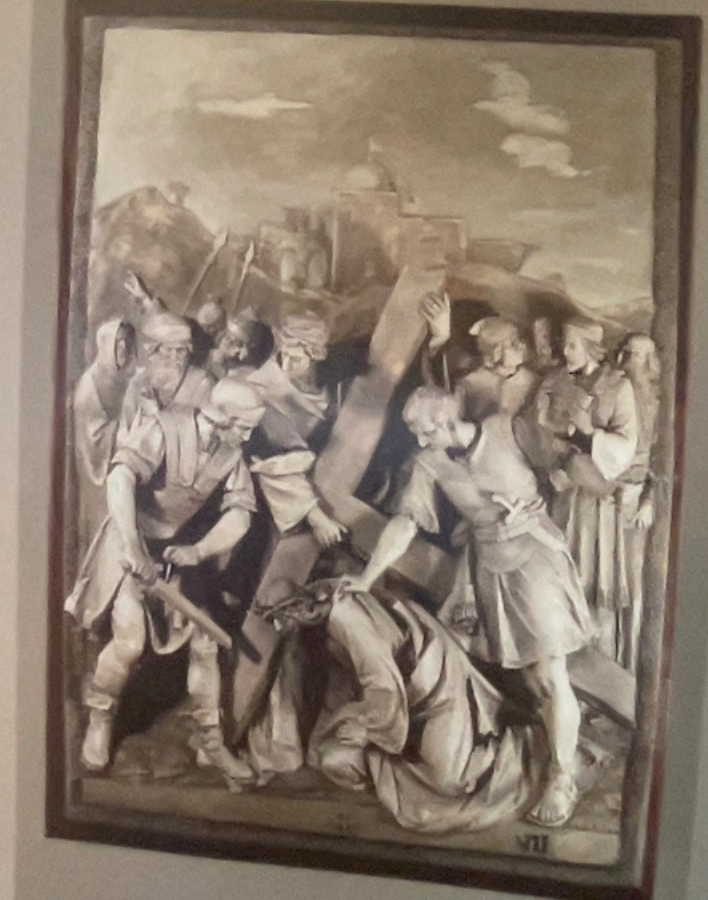 I spent a lot of time looking at details of these Stations in order to write a sort of scavenger hunt for my students at OLOH many years ago. In Station 9 when Jesus is stripped of his garments there is a character who is not dressed as a Roman or as a first century Israelite. Here’s a picture of the station from a picture in a book.