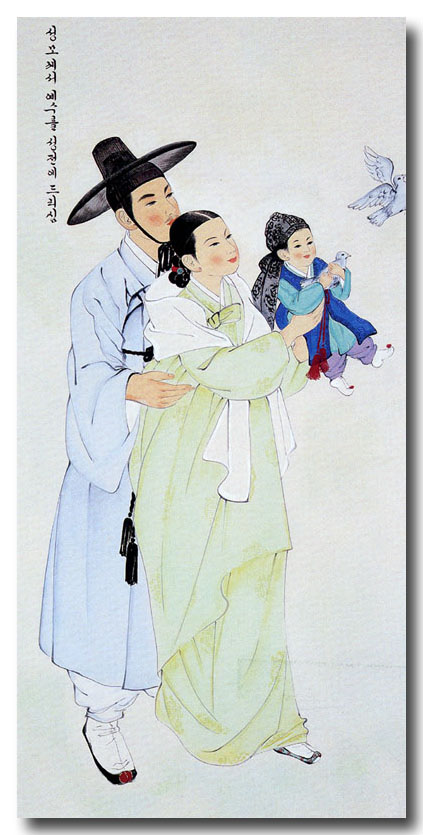 Madonnas of the Morning Calm: Sacred Images from Korea was an exhibit at the University of Dayton’s Marian Center in 2006. It featured a Korean artist, O-Sek Bang. The promotional material says that “Ms. Bang, whose grandparents were martyrs, was a member of the Sisters of the Blessed Korean Martyrs for twenty-five years.” I couldn’t really find anything about them except that they seem to be a real organization. Follow the link below, and scroll to the third and fourth pages. There are thumbnail images of many more pictures that were in the exhibition. They are beautiful and can be expanded with another click. The header is The Madonna and Child, 1975 also by O-Sek Bang
