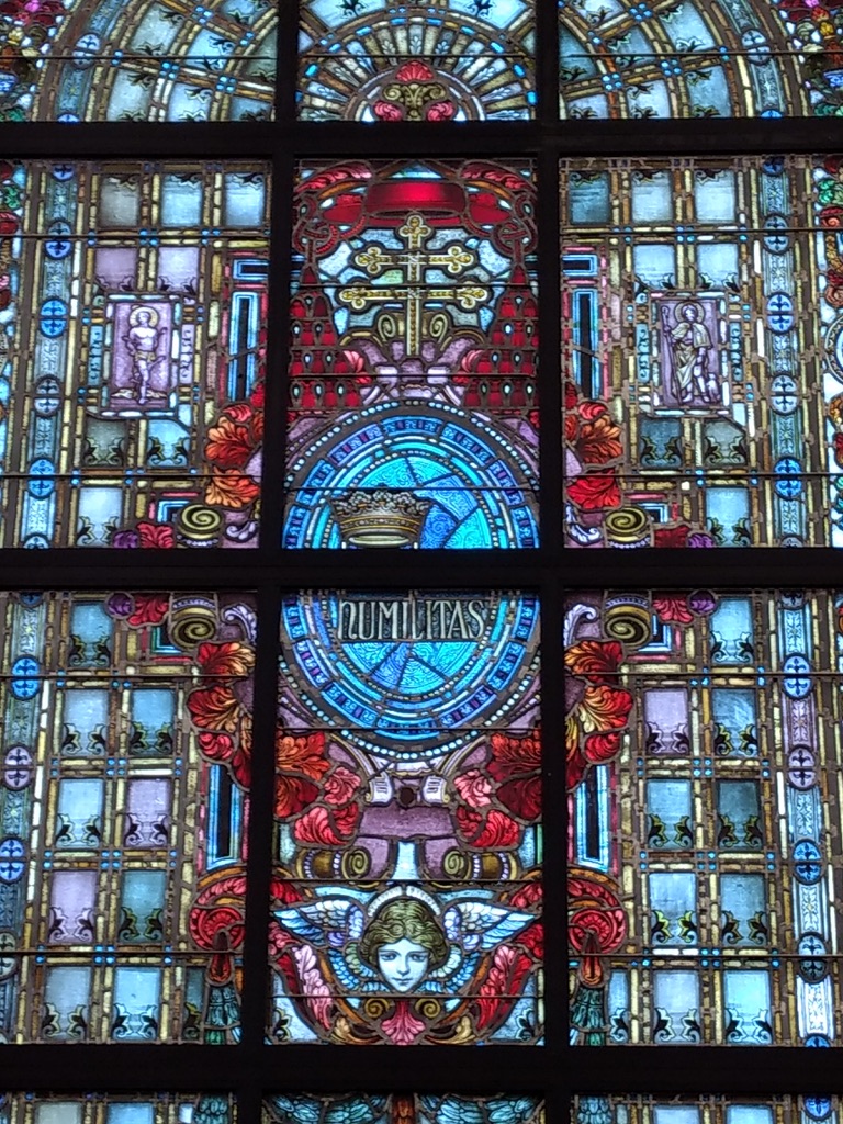 Here’s a wider view of the window. There are twelve oval medallions around the edges of the window but they aren’t all visible in this picture. I suspect they are for the twelve apostles but I couldn’t identify all of them. You can see square medallions closer to the center of the window, with Saint Sebastian on the left and Saint Peregrine on the right. The crown, laid aside, and the word, Humilitas, give the window its name.