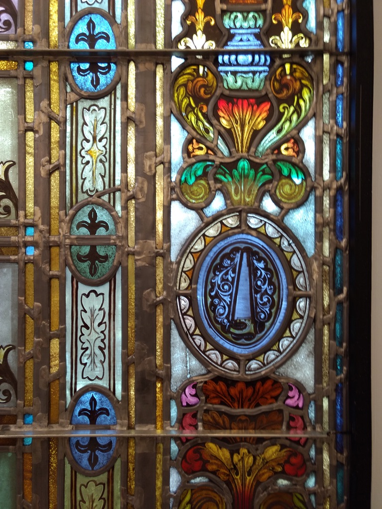 This picture shows four of the square medallions. The one of the right is Saint Joan of Arc. There’s one more medallion below these. The window is at least twenty feet tall, two stories high.