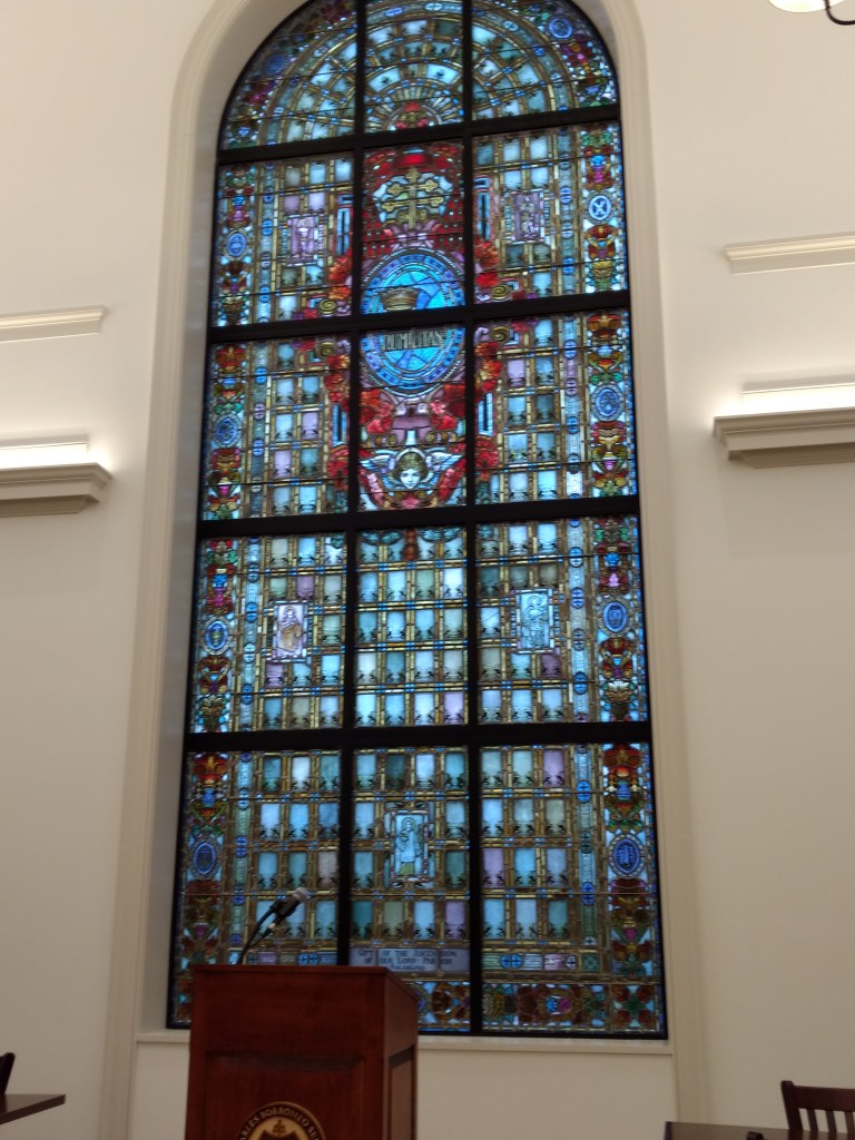 Here’s a picture from the edge of a giant stained glass window in the refectory (cafeteria). I think the saw is a symbol for the Apostle Simon.