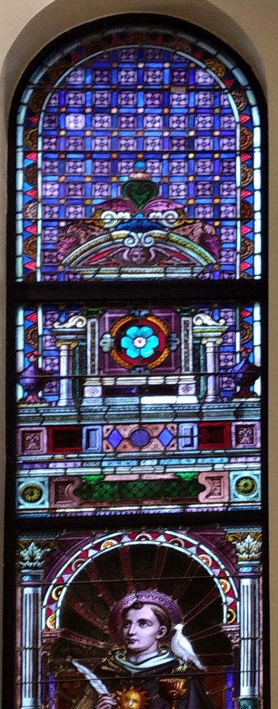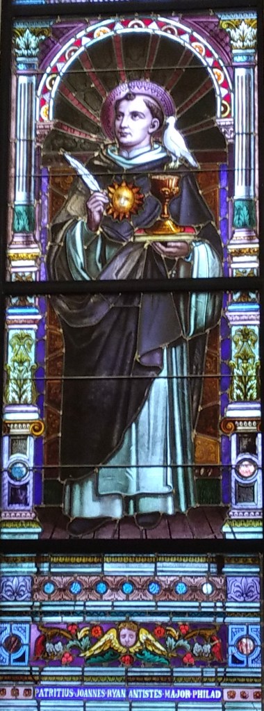 Saint Thomas Aquinas from a stained glass window in the Chapel of the Immaculate Conception, Saint Charles Borromeo Seminary, Gwynnedd, PA.