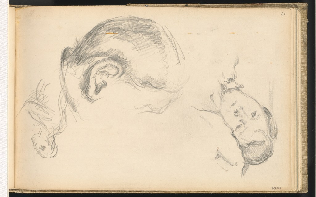 The National Gallery of Art has a sketchbook of Cezanne’s https://www.nga.gov/features/cezanne-sketchbook.html Here is one of the sketches. I don’t know why it is called Three Heads including Madame Cezanne…. because I only see two.