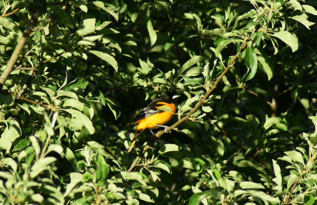 I was sent this picture to post if I wanted to. It’s a Baltimore Oriole, and I love the photo. Once I was watching a cardinal and wondering idly how such bright red birds were able to vanish. The cardinal turned and I saw how the sudden dull red on its back allowed it to blend instantly into the landscape. It fooled my eye because I was still looking for the bright color. The oriole shows something similar here. That yellow color is going to look like a flash of sunlight and the bird will disappear when it moves. Such fun!