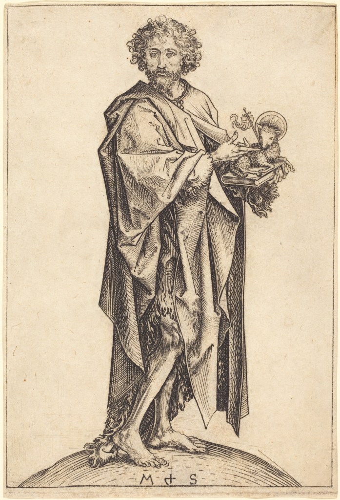 Saint John the Baptist in the Wilderness with the Lamb of God, Surrounded by the Symbols of the Evangelists and the Four Fathers of the Church. 1466. Master E.S. Artist, German, active c. 1450 – 1467 (possibly Ambrose, Augustine, Jerome and Pope Gregory I… but you can study the symbols and try to guess).