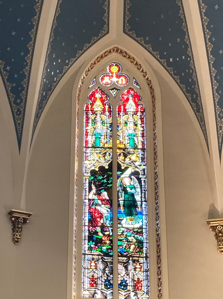 Years ago I saw these windows above the altar in a church which had been stripped of its decoration in the 1970’s, as part of a renovation. The church at that time was all one color and the altar space was a soaring emptiness, with beautiful windows. When I realized what the windows portrayed I was enchanted.