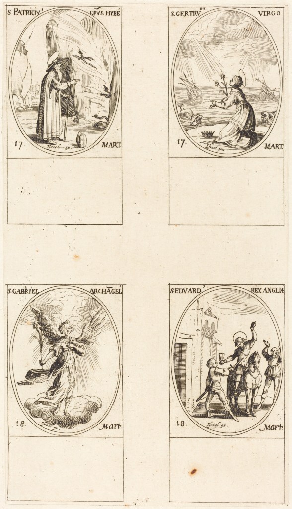 Saint Patrick; Saint Gertrude; Saint Gabriel, Archangel; Saint Edward. Jacques Callot, c. 1632/1635, French. National Gallery of Art, DC, public domain