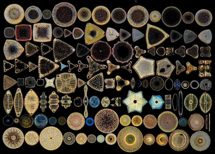 This lovely picture of diatoms comes from a website showing how to study diatoms. https://www.mccrone.com/mm/the-collecting-cleaning-and-mounting-of-diatoms/