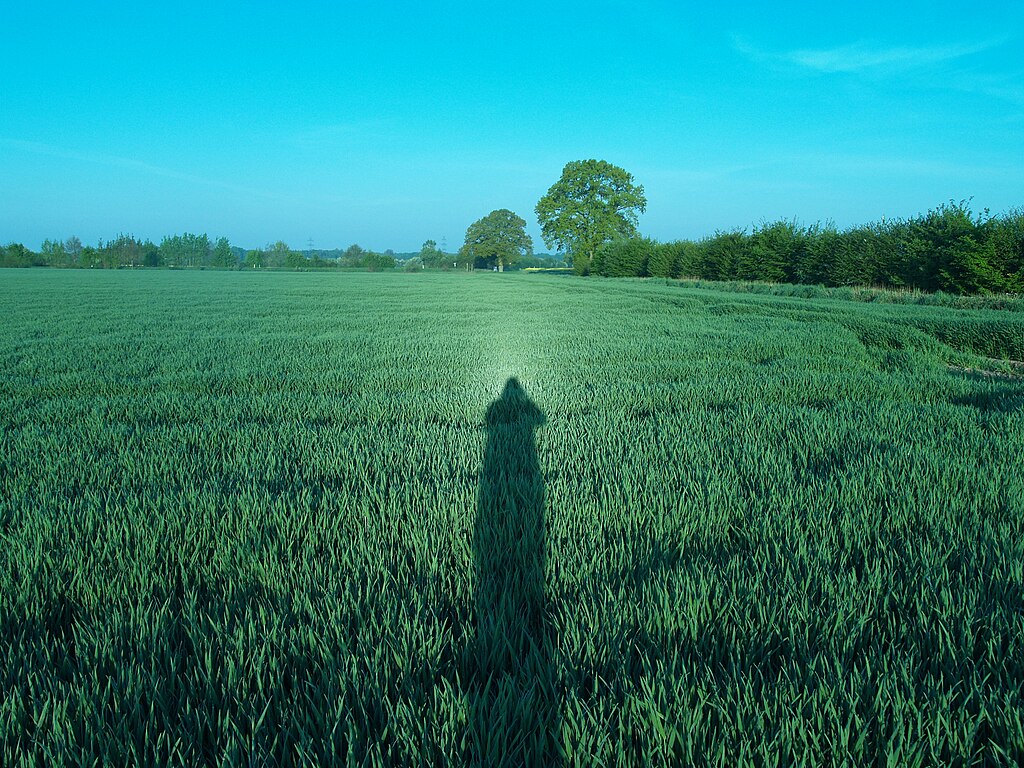 I used to tell my students they had halos, when we walked from the school to the church early Friday mornings. I was responsible for the student lectors and would take them to church when the dew was often still on the grass, to practice their reading. Sometimes I’d encourage them to spend ten seconds looking at their shadows in the grass and checking out the brightness of the dewdrops around their own heads. Some of them could see it and some couldn’t. It’s easier to see the brightness if you move your head a bit and watch a specific section of grass grow brighter or darker depending on your position. This phenomenon, known as the Heilegenschein, is tricky to see the first time.
