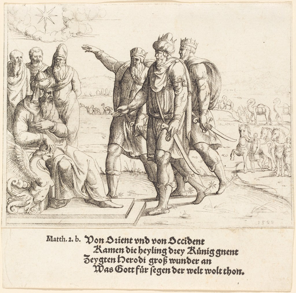 The Three Kings Tell Herod of Christ’s Birth. Etching. 1549. Augustin Hirschvogel. National Gallery of Art. Public domain.