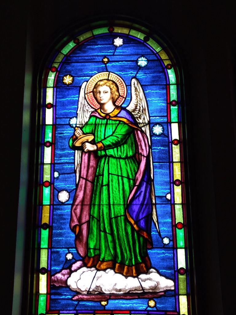 I had never heard of a Saint Adrian until I passed through Adrian, Minnesota on a car trip seven or eight years ago. The church of Saint Adrian has a lovely spire, visible for a long way and my companion and I were hot and tired. We stopped in the parking lot, rested for a bit and went inside. Okay. Angels with drums, castanets, and possibly a psaltery? Gorgeous.