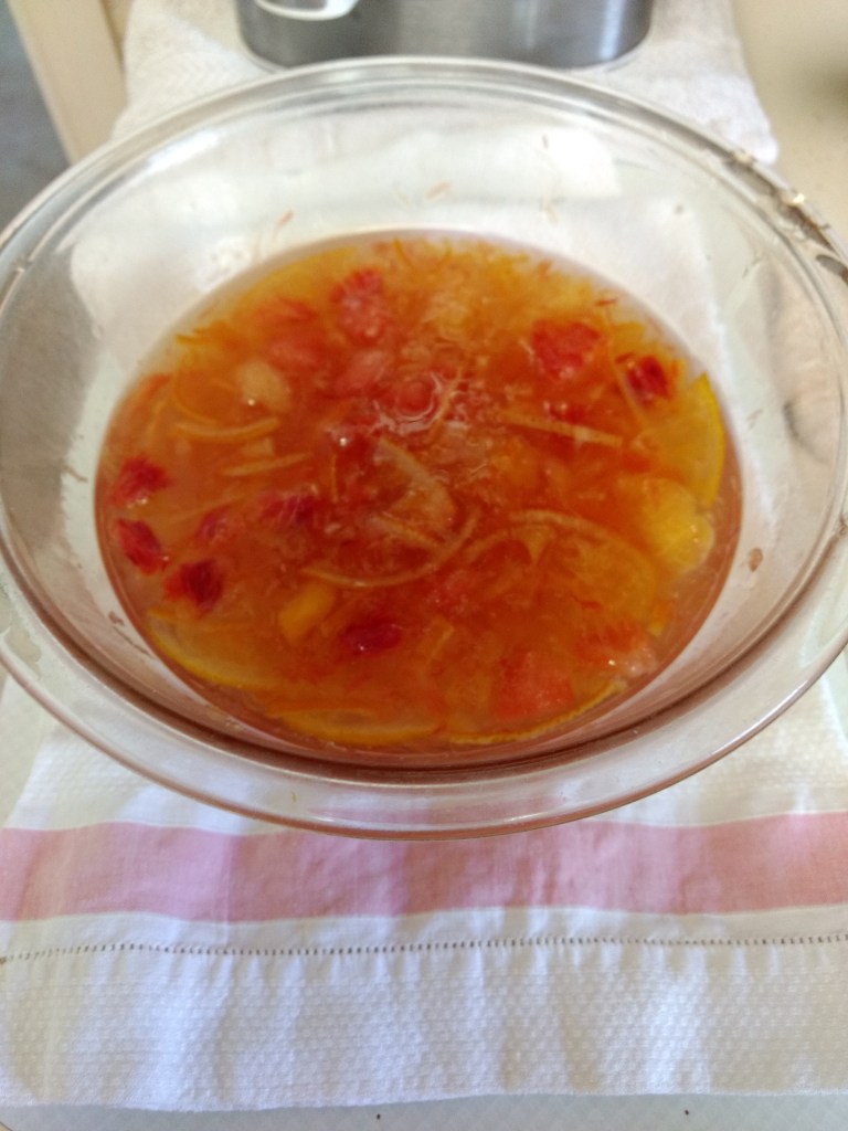 For my cold inspired efforts, I used Meyer lemons, a blood orange, and a star ruby grapefruit. I tried zesting the peel but, having started with the grapefruit I eventually gave that little operation the go-by. The grapefruit skin was so tough that after I had zested a little bit, I was completely fed up, and unsure about using the peel anyway. Instead I sectioned the grapefruit and put all the fruit bits aside. I peeled the pith off the outer skin and set that in a different bowl, then cut the skin into tiny slivers. At least, I did that for about half the grapefruit and then gave up. Again. The lemons I sliced as thinly as I could, peel and all. I tossed the seeds into the pith bowl. The orange I deal with somewhere in between these two extremes.