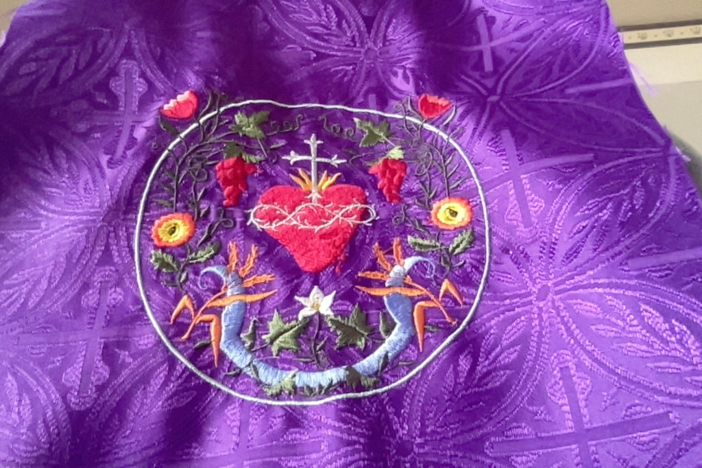 I’ve cooked a lot, and today I hope to sew a lot. A purple vestment is in the works. And possibly learning to make a pall. That’s the stiff square on top of the chalice during Mass. It’s there to keep bees, and whatnot, from falling into the Precious Blood. And yes, that did and does happen. I have a pattern that my embroidery machine will stitch, but it has ‘wheat’ in the pattern that is done in orange so it looks like a weird lobster. See what I mean?