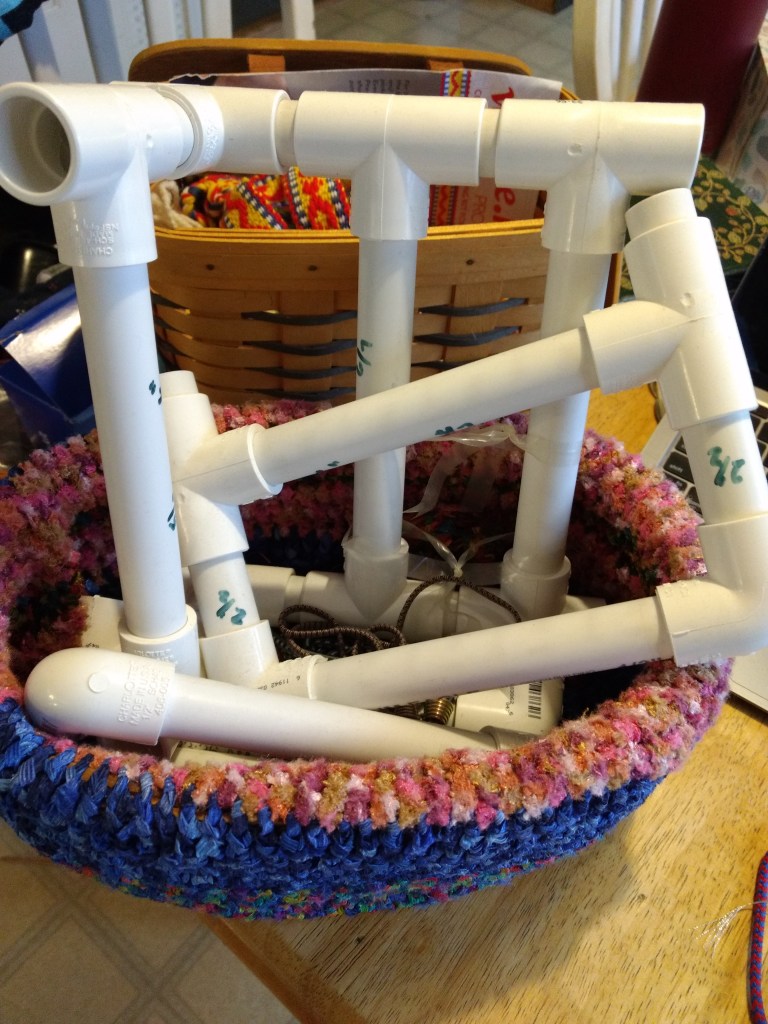 … I tried to make my own frame out of PVC pipe. I don’t have pictures of the result because I took it apart when I wanted to use the extra four feet of counter that it took up for something else. (A different pile of junk, I’m sure.)