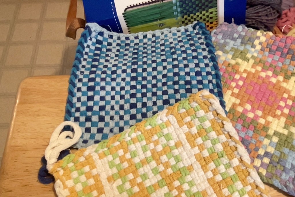 I loved making my first potholders with the loops that are sold, and then weaving my own yarn onto the frame. That little effort still needs work around the edges. I tried felting the results and am still experimenting.