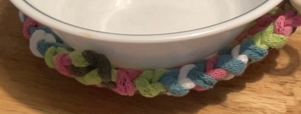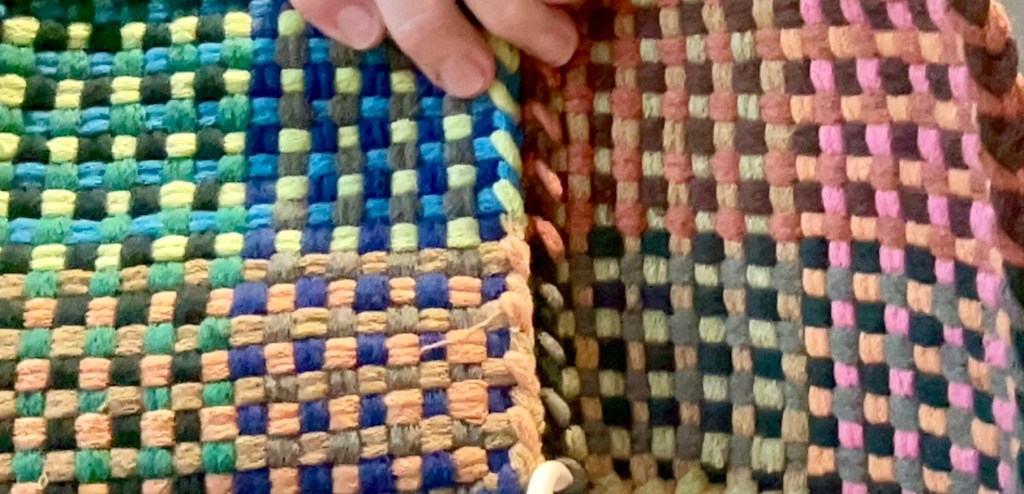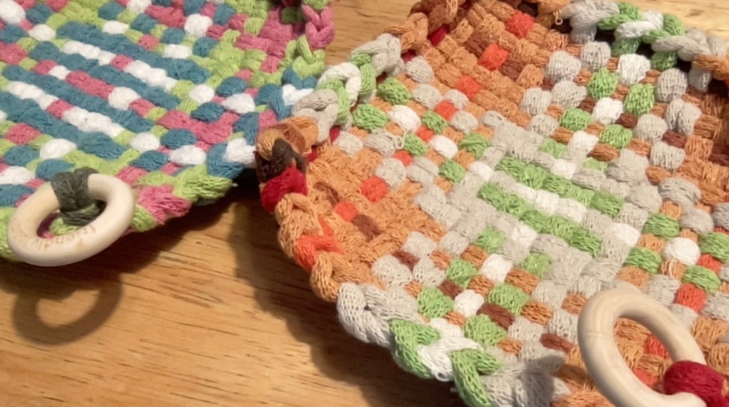 These two potholders look as if I didn’t know what I was doing and created lumps. But in fact this is a very clever way of weaving a utensil for the microwave. The curvy shape allows a container to be heated and then removed from the microwave with the holder wrapping closely around it. Your bowl of soup steams away without any finger burns. I really love it. https://potholders.piglet.org/