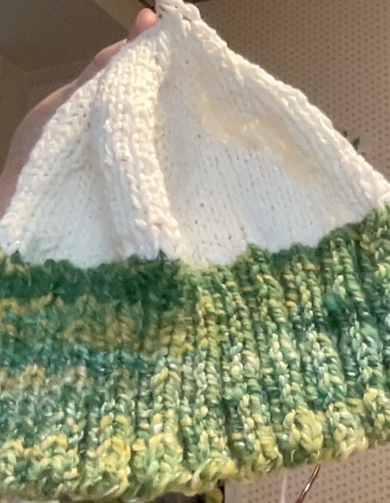 And I have a young friend in Iowa who is about to have her first baby. She doesn’t know the sex and it’s March, so I’m making a hat with a green brim. The white part unfortunately had to be ripped out three or four times while I tried various different yarns to go with the brim. I still have to bind off the last eight stitches.