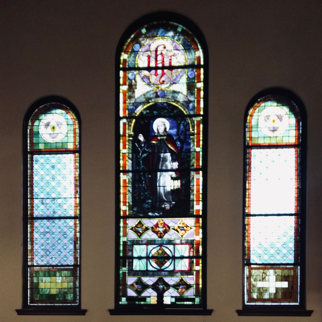 Stained glass windows like this are terribly hard to capture with my little Android phone. This one starts about eight feet off the ground and goes up about twenty more feet!