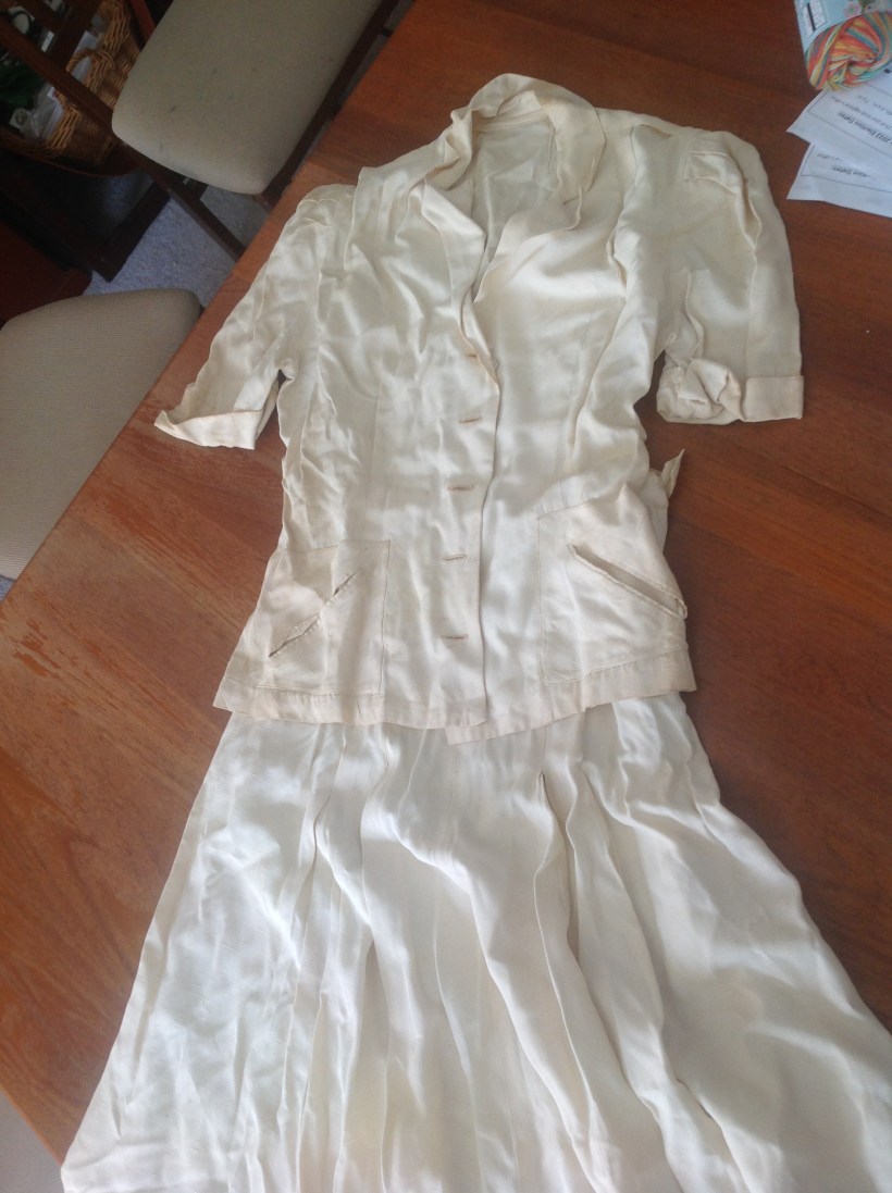 More on that wedding dress. I washed it in Dawn soap and then let it soak in a diluted solution of a commercial product that uses hydrogen peroxide and is not named Oxyclean. This took out a lot of the brown discoloration in the fabric. I was thinking of it as linen at that moment, [...]